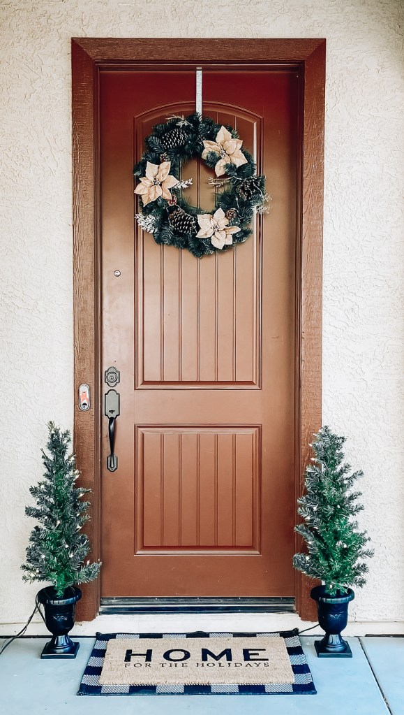 Onto the front porch! Who am I kidding? We don’t have “porches” in Arizona. It’s more of a front patio. I kept it cute and simple this year. I’ve been loving the look of a rug under the doormat, so of course I had to do that. We got these two 3.5 foot trees at Walmart, but the pots were like a distressed gold. I didn’t like it so we painted them matte black and it made all the difference! I put twinkle lights in my wreath, you can’t see it in the daylight, but it add a nice little touch at night! Wishing you all happy holiday decorating!
